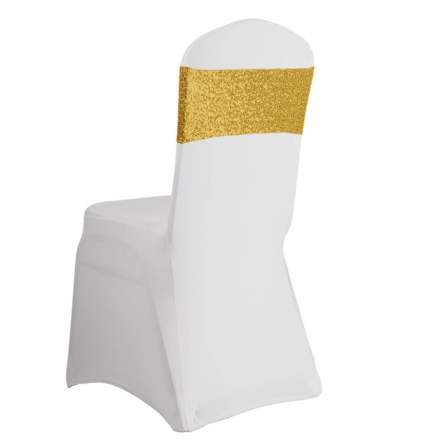 These gold chevron sequin and spandex chair bands are a simple way to add some sparkle to your table décor. Made for wider chairs that are not completely square, you simply slip these bands over the chair back. That’s all there is to it.