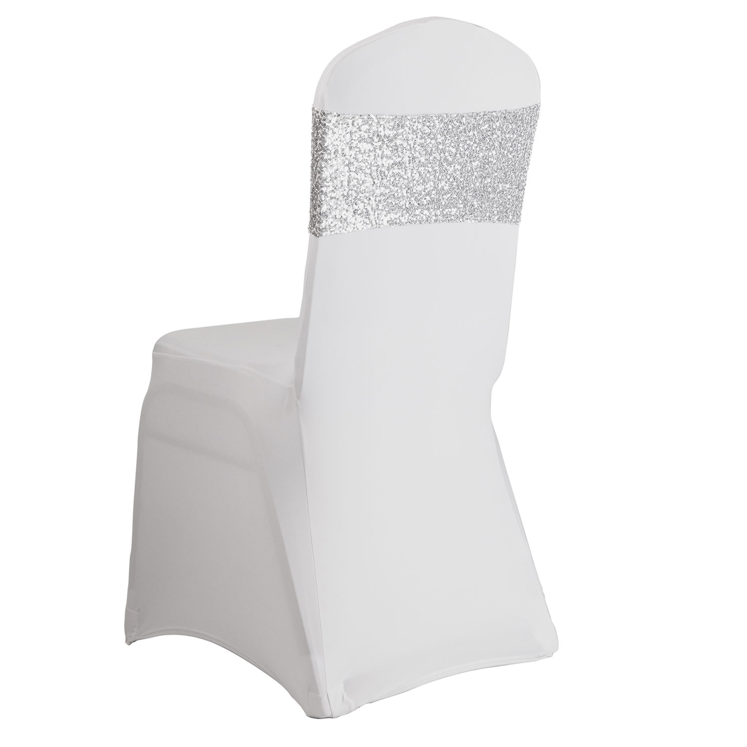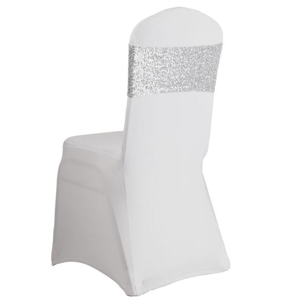 These shimmering silver sequin and spandex chair bands are a simple way to add some sparkle to your table décor. Made for wider chairs that are not completely square, you simply slip these bands over the chair back. That’s all there is to it.