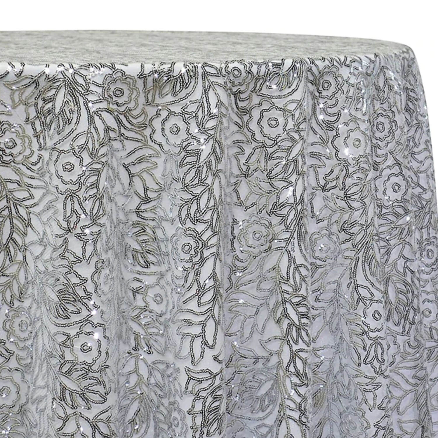 Build your perfect event setting by using our silver fancy leaf sequin overlay. This silver fancy leaf sequin overlay is filled with embroidered flowers and leaves on a polyester sheer fabric and decorated with delicately placed sequins. Our many size options for this silver fancy leaf sequin overlay allow you to choose the right one for you.