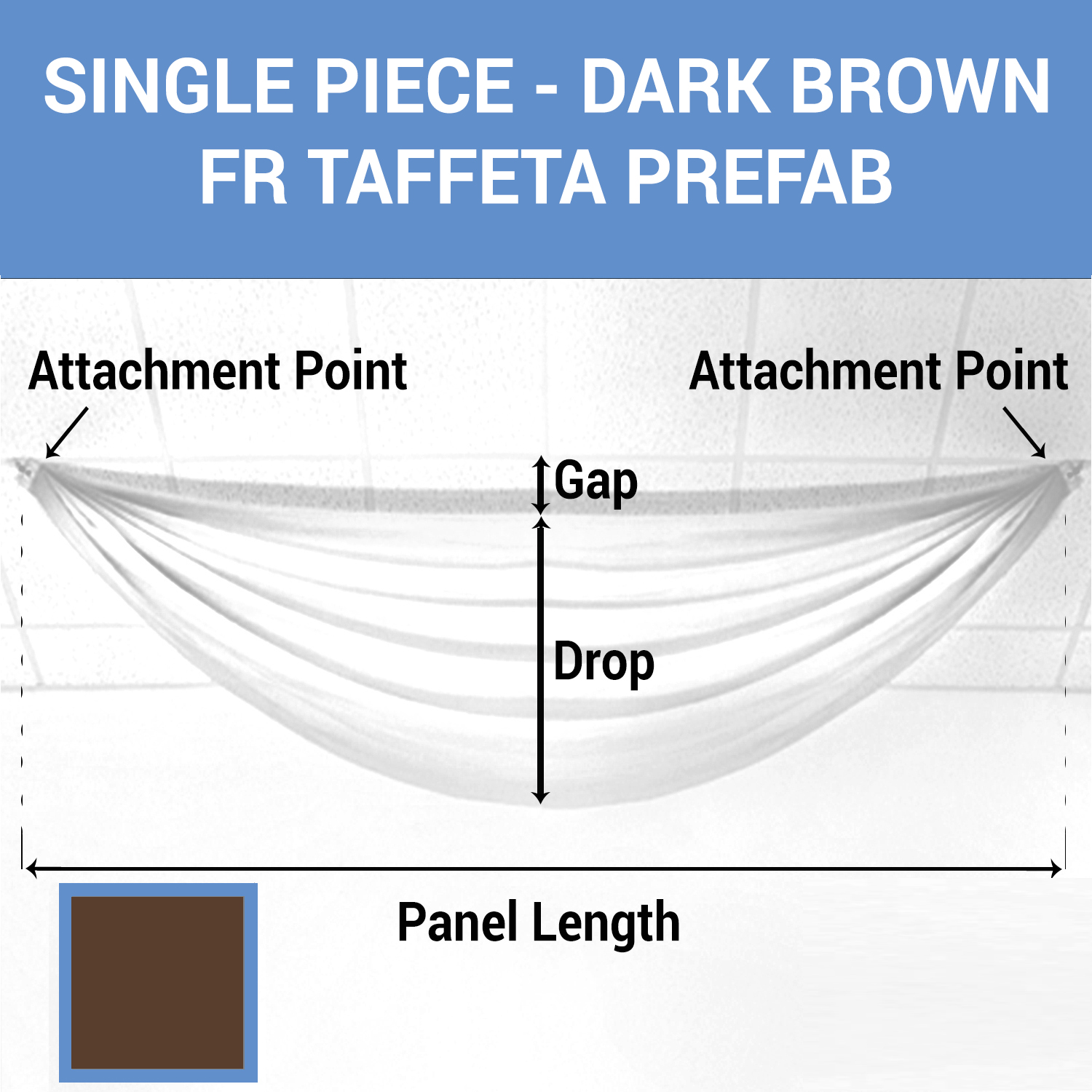 Our dark brown taffeta prefabricated ceiling drape panel gives you the ability to customize your drapery. Choose the length and drop of our dark brown fabric panel and prepare for the easiest setup you’ll experience. Our hand-sewn panels are fire-retardant and made with high-quality dark brown taffeta fabric.
