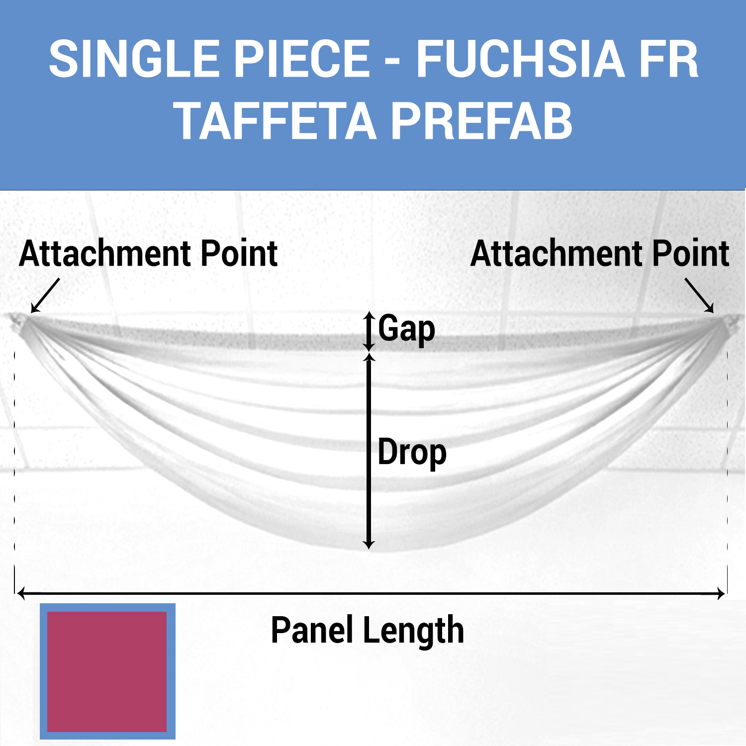 With this fuchsia taffeta prefabricated ceiling drape panel, you can build the perfect ceiling drapery look. Choose the length and drop of our fuchsia fabric panel and prepare for the easiest setup you’ll experience. Our hand-sewn panels are fire-retardant and made with high-quality fuschia taffeta fabric.