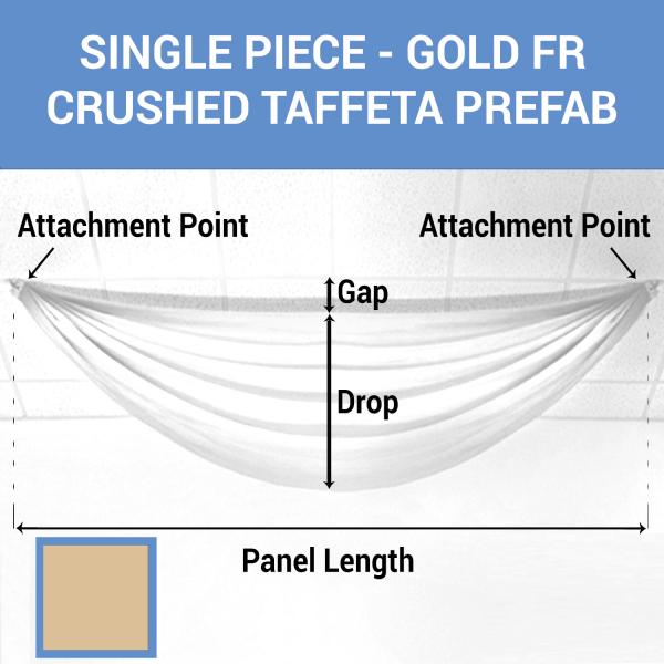 This dazzling gold crushed taffeta prefabricated ceiling drape panel will take your decor to the next level when you add it to your ceiling drapery. Our gold panels are made with crushed taffeta for a textured look on a gold silky hand-sewn fabric panel. These panels can be washed and are fire-resistant.