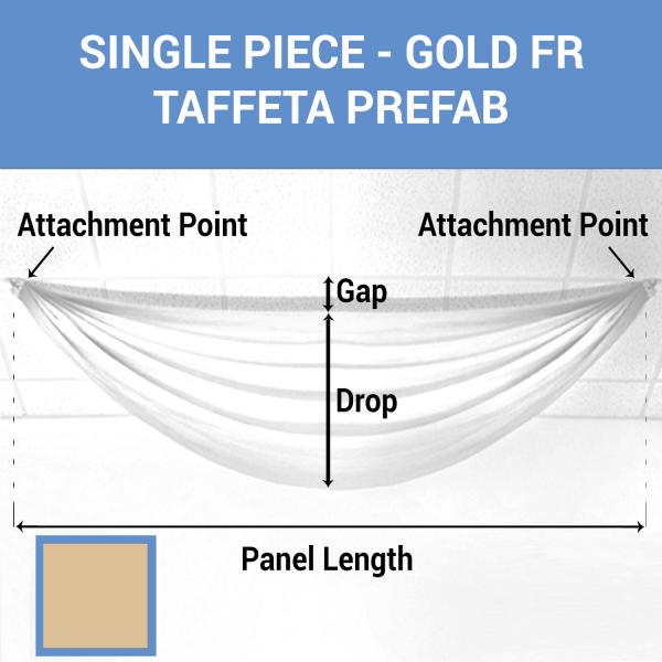 Customize your ceiling drapery to fit your needs with our gold taffeta prefabricated ceiling drape panel. Choose the length and drop of our gold fabric panel and prepare for the easiest setup you’ll experience. Our hand-sewn panels are fire-retardant and made with high-quality gold taffeta fabric.
