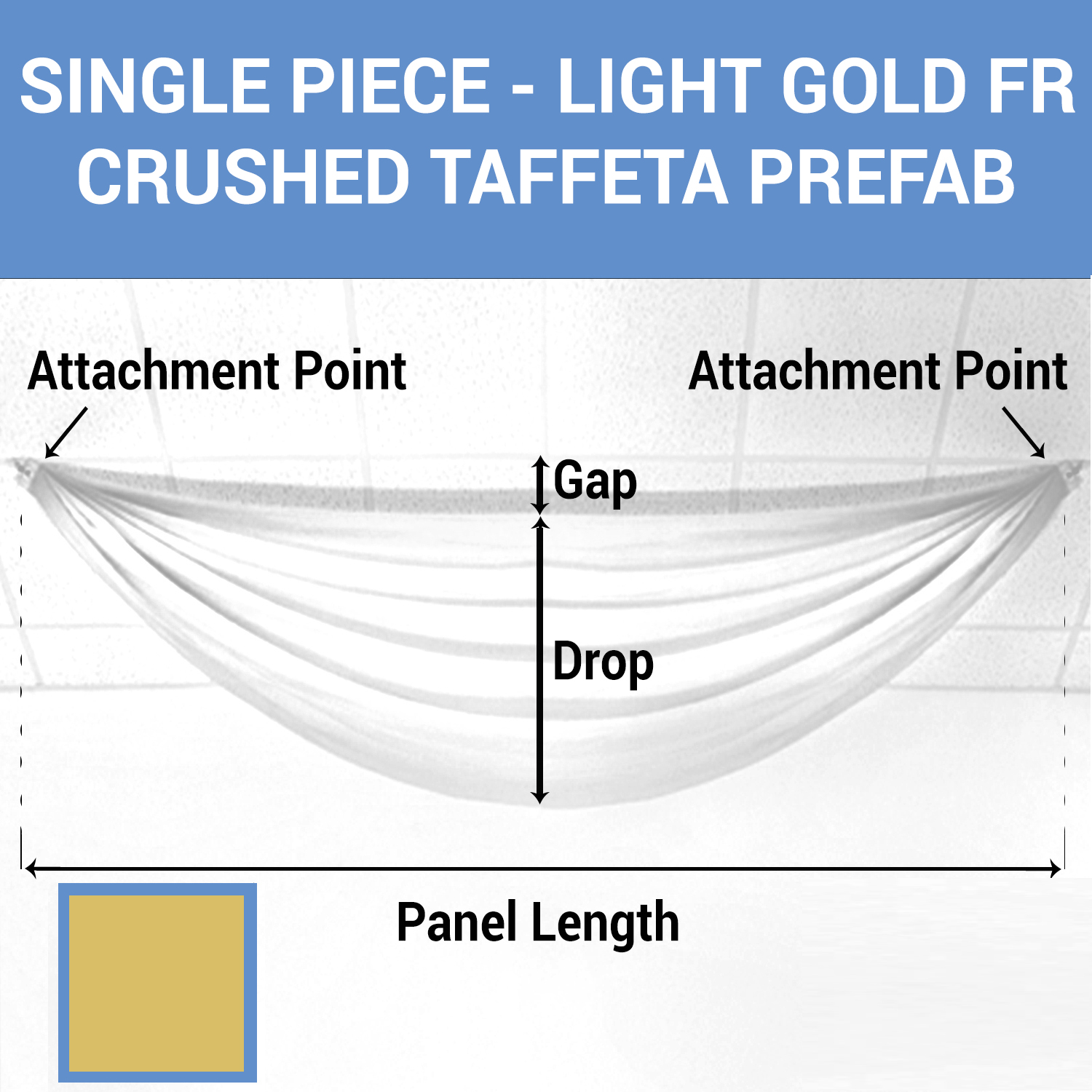 This charming light gold crushed taffeta prefabricated ceiling drape panel turns drab ceiling drapes into a fabulous focal point your guests can’t miss. Our light gold panels are made with crushed taffeta for a textured look on a light gold silky hand-sewn fabric panel. These panels can be washed and are fire-resistant.
