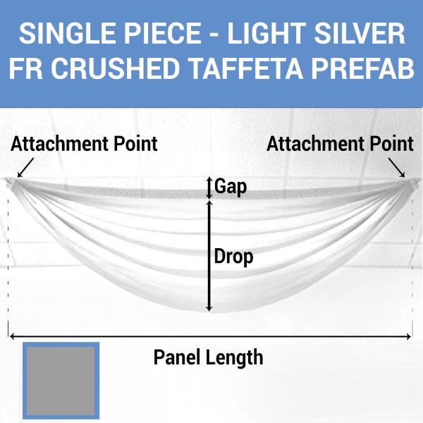 This splendid light silver crushed taffeta prefabricated ceiling drape panel adds a touch of elegance to your decor and stands out in your custom ceiling drapings. Our light silver panels are made with crushed taffeta for a textured look on a light silver silky hand-sewn fabric panel. These panels can be washed and are fire-resistant.