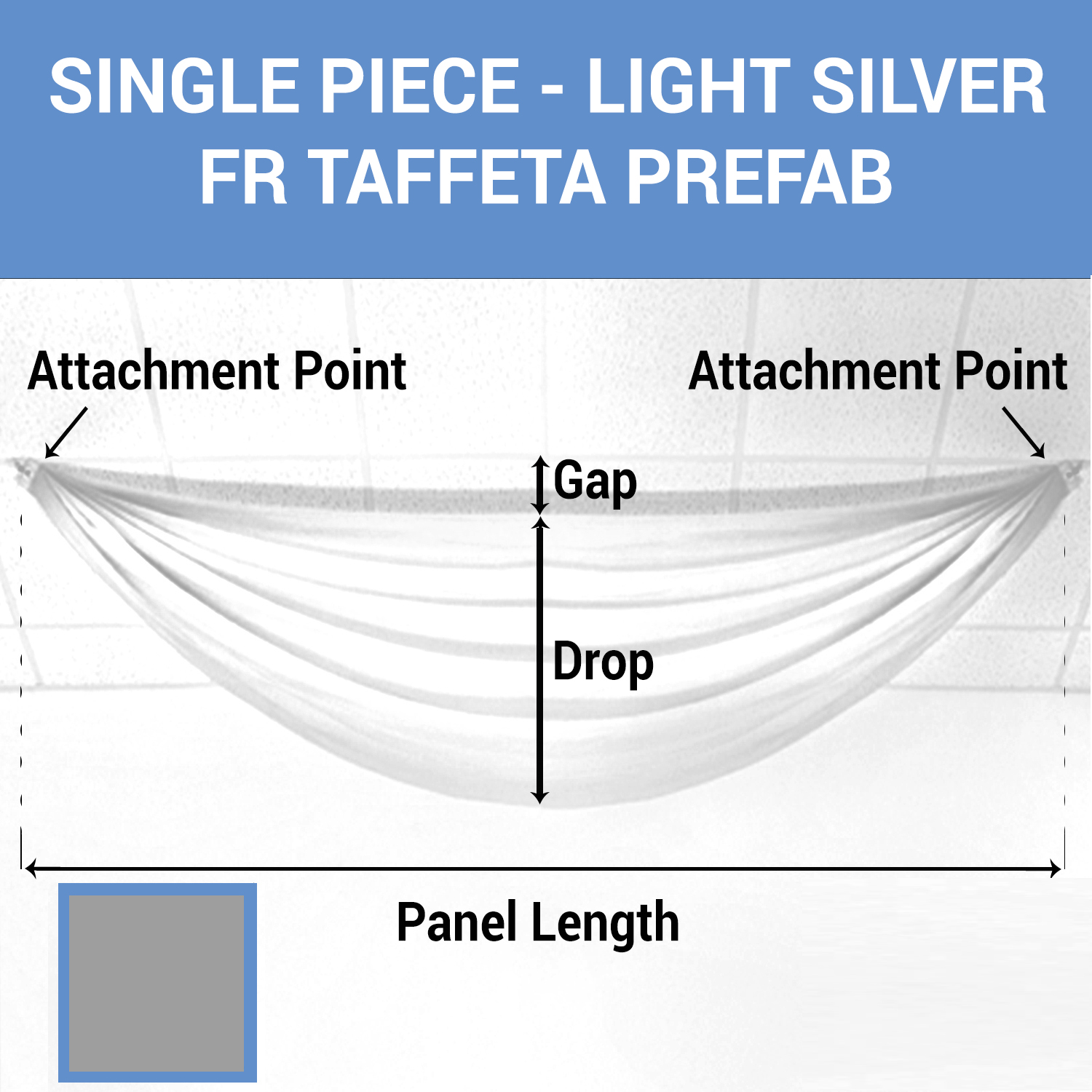 These light silver taffeta prefabricated ceiling drape panels will sparkle and shine over your event, leaving your guests in awe. Choose the length and drop of our light silver fabric panel and prepare for the easiest setup you’ll experience. Our hand-sewn panels are fire-retardant and made with high-quality light silver taffeta fabric.