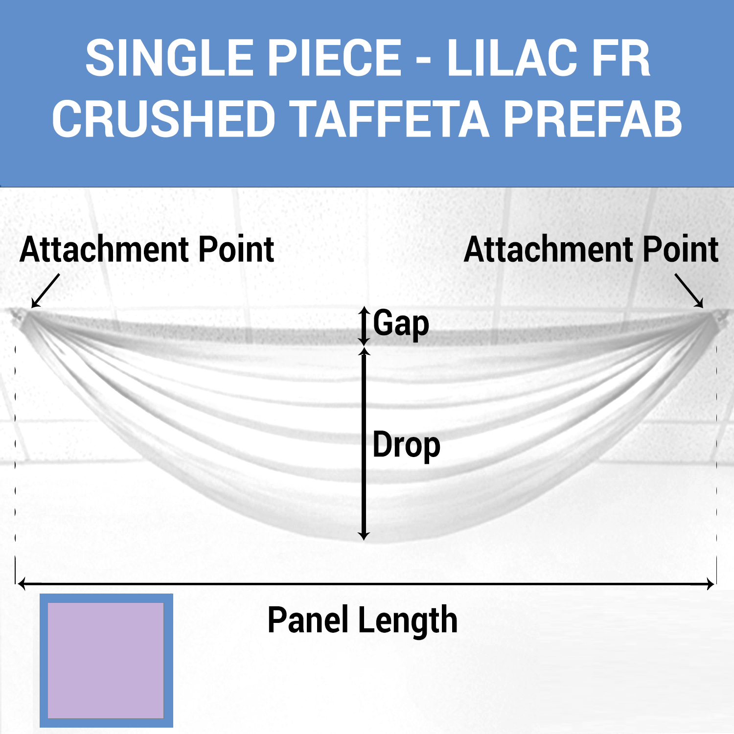 This lovely lilac crushed taffeta prefabricated ceiling drape panel creates a warm and beautiful atmosphere that will leave your guests feeling great. Our lilac panels are made with crushed taffeta for a textured look on a lilac silky hand-sewn fabric panel. These panels can be washed and are fire-resistant. Length Options: 10ft to 20ft Drop Options: 1ft to 4ft