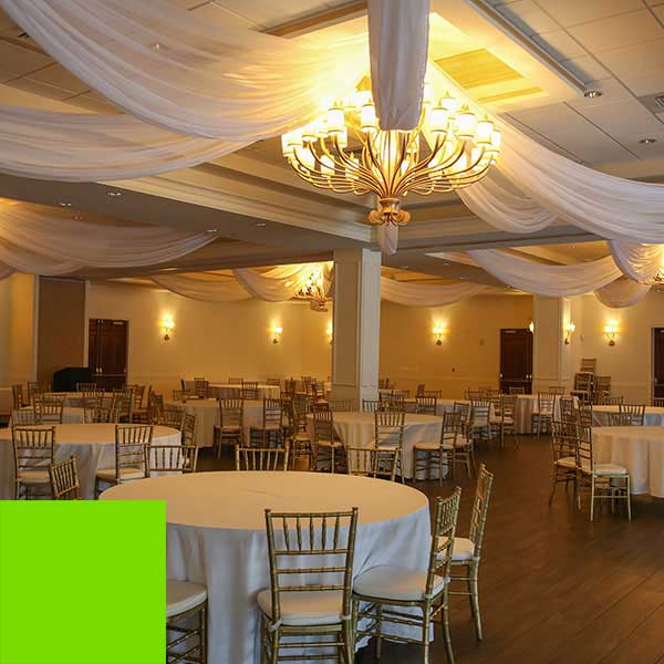 This radiant lime crushed taffeta prefabricated ceiling drape panel stands out in any ceiling drapery and adds a colorful splash to your decor. Our lime panels are made with crushed taffeta for a textured look on a lime silky hand-sewn fabric panel. These panels can be washed and are fire-resistant.
