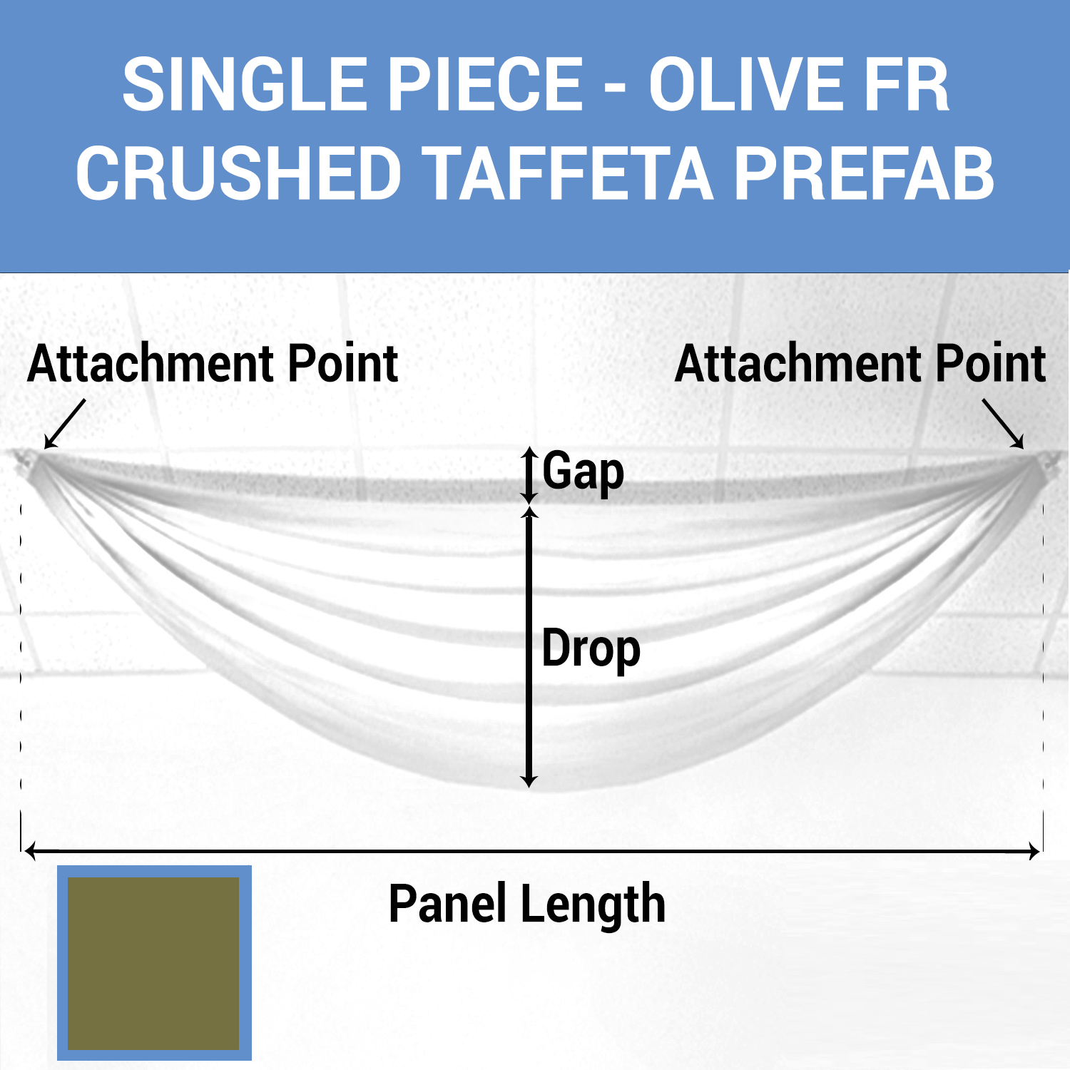 This pleasant olive crushed taffeta prefabricated ceiling drape panel brings a rich, flavorful fabric into your decor to create the perfect look. Our olive panels are made with crushed taffeta for a textured look on an olive silky hand-sewn fabric panel. These panels can be washed and are fire-resistant.