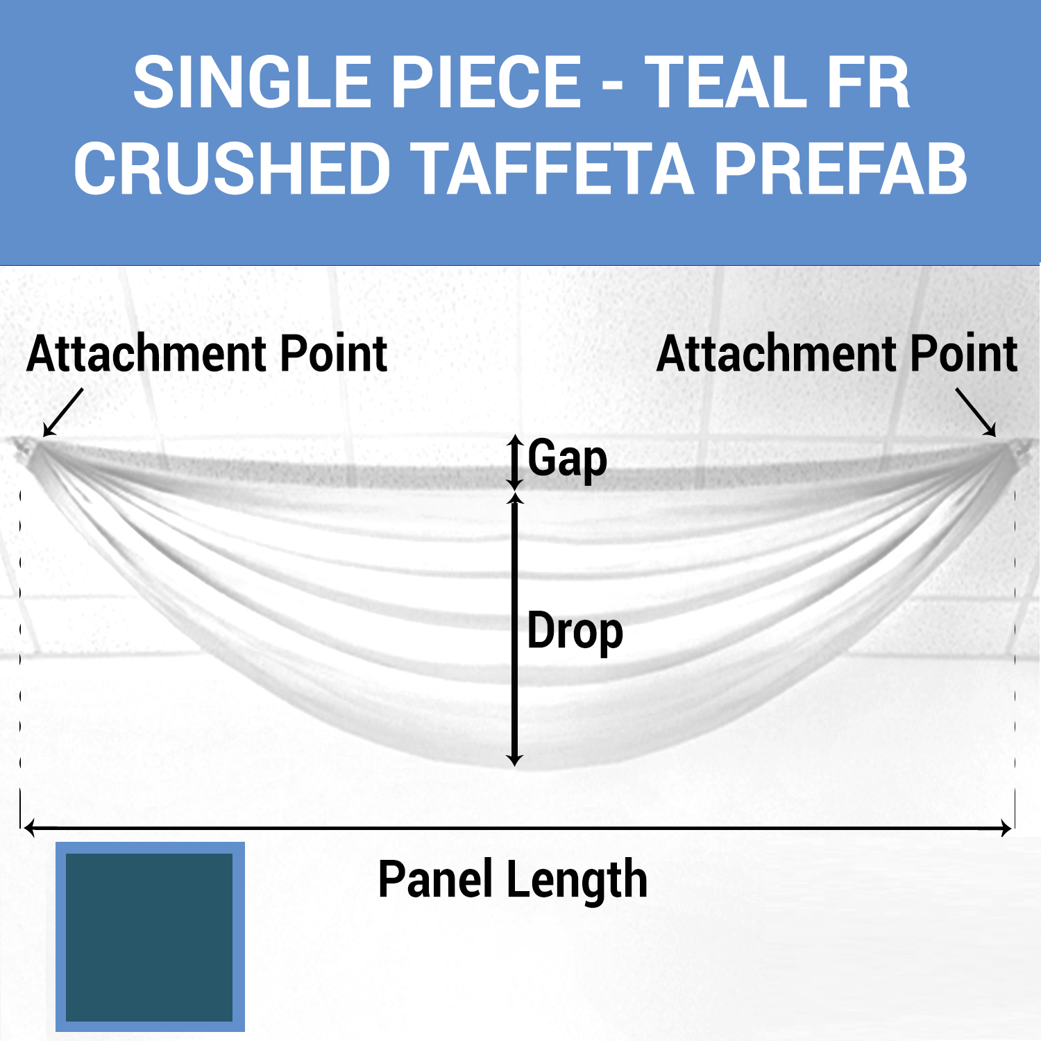 This elegant teal crushed taffeta prefabricated ceiling drape panel leaves your guests in awe of this amazing and brilliant teal color. Our teal panels are made with crushed taffeta for a textured look on a teal silky hand-sewn fabric panel. These panels can be washed and are fire-resistant.