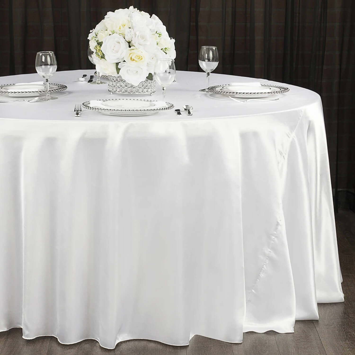 This round, shimmering satin tablecloth will elevate the look of your décor. The luxurious sheen of this fabric bounces the light while the fabric itself hangs in delicate looking folds to create a romantic atmosphere for your special event.