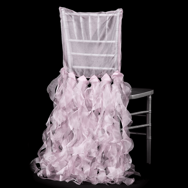 The look of the fabric ribbons is similar to that of the skirts in classic ball gowns, but the blend of organza keeps the fabric light and airy. The pale pink fabric pairs well with lighter color schemes, and the overall aesthetic is fun and whimsical. These chair covers are perfect for weddings, birthday parties, proms and formal dances, galas, or any event where you want to add an element of fairy tale princess.
