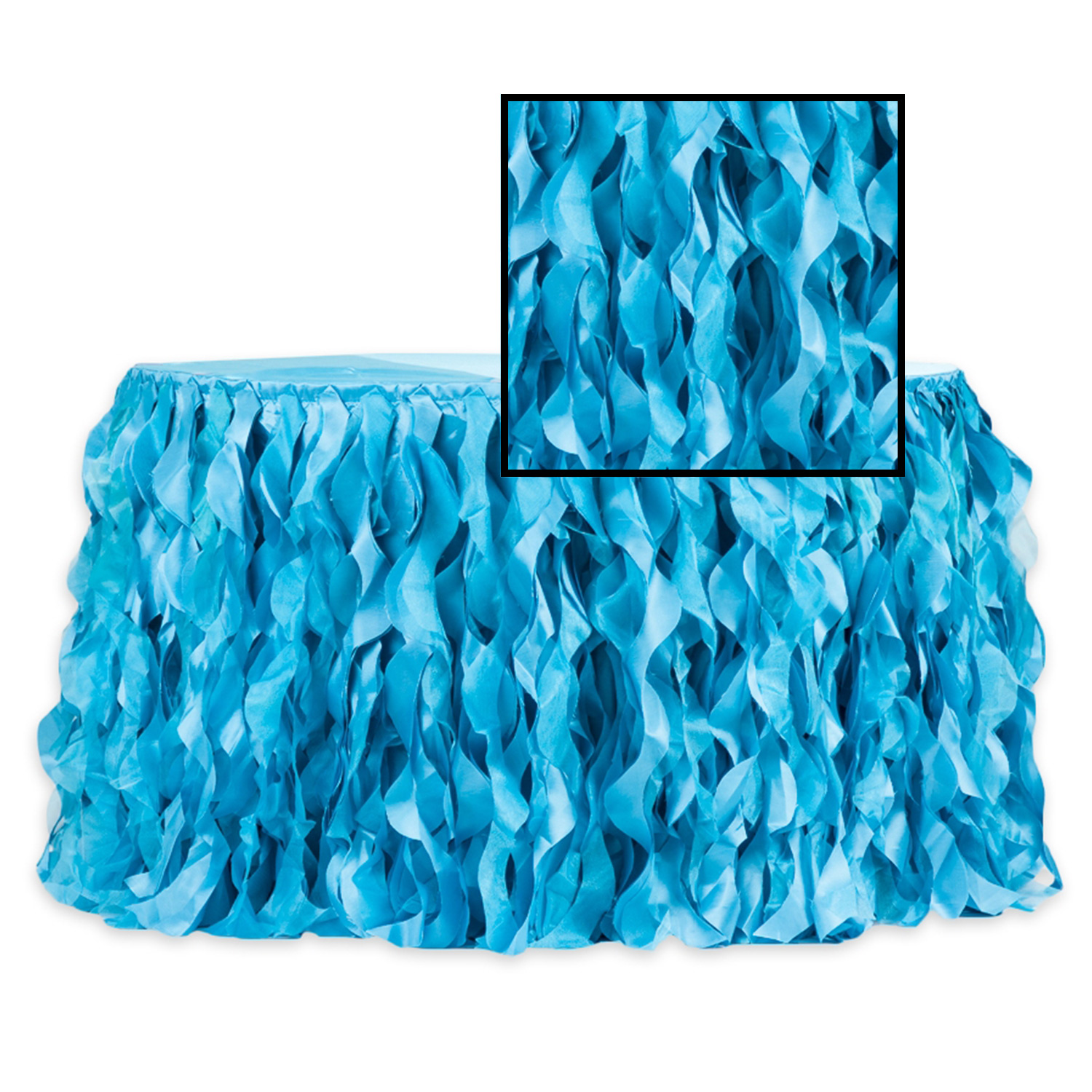 Add some texture and luxrious flair to your your birthdays, quinceaneras, weddings, and more with these spiraling taffeta and organza table skirts. Made with high quality taffeta lining, they are suitable for all manner of stylish themes and events. The aqua blue hue also lends it an especially vibrant look, helping to mask those otherwise drab interiors.