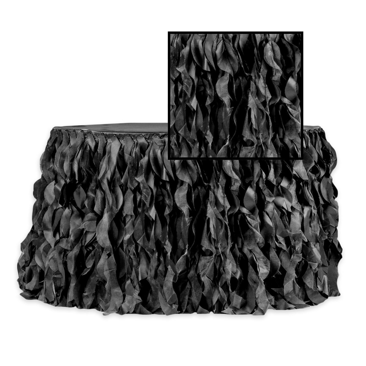 Add some texture and luxrious flair to your your birthdays, quinceaneras, weddings, and more with these spiraling taffeta and organza table skirts. Made with high quality taffeta lining, they are suitable for all manner of stylish themes and events. The black hue also lends it an especially sleek look, helping to mask those otherwise drab interiors.