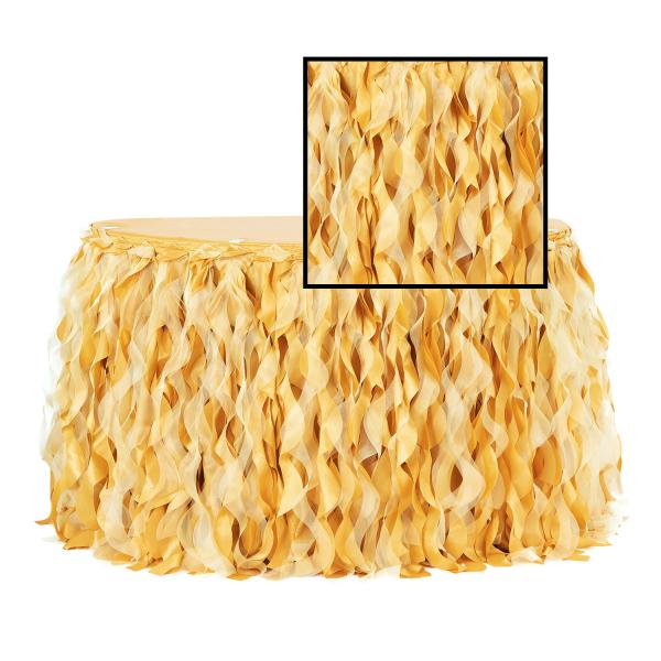 Add some texture and luxrious flair to your your birthdays, quinceaneras, weddings, and more with these spiraling taffeta and organza table skirts. Made with high quality taffeta lining, they are suitable for all manner of stylish themes and events. The bright gold hue also lends it an especially chic look, helping to mask those otherwise drab interiors.