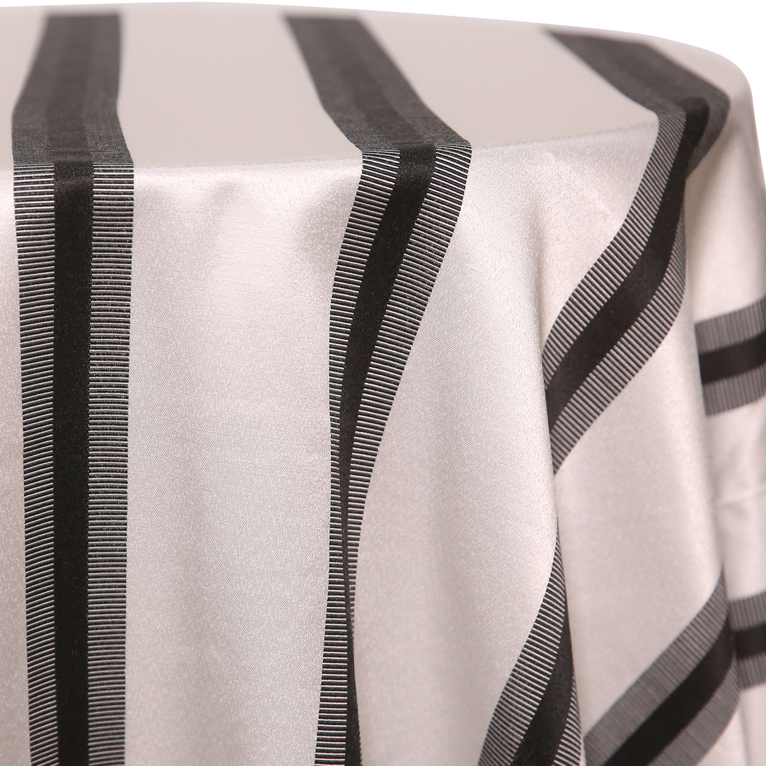 There is beauty in simplicity, as the classic Tuxedo has proven. And that look translates well to table décor. Add that classic simplicity to your event with these table cloths. Black stripes, offset with black pin striping, on a field of off white, everything looks better when dressed its best.