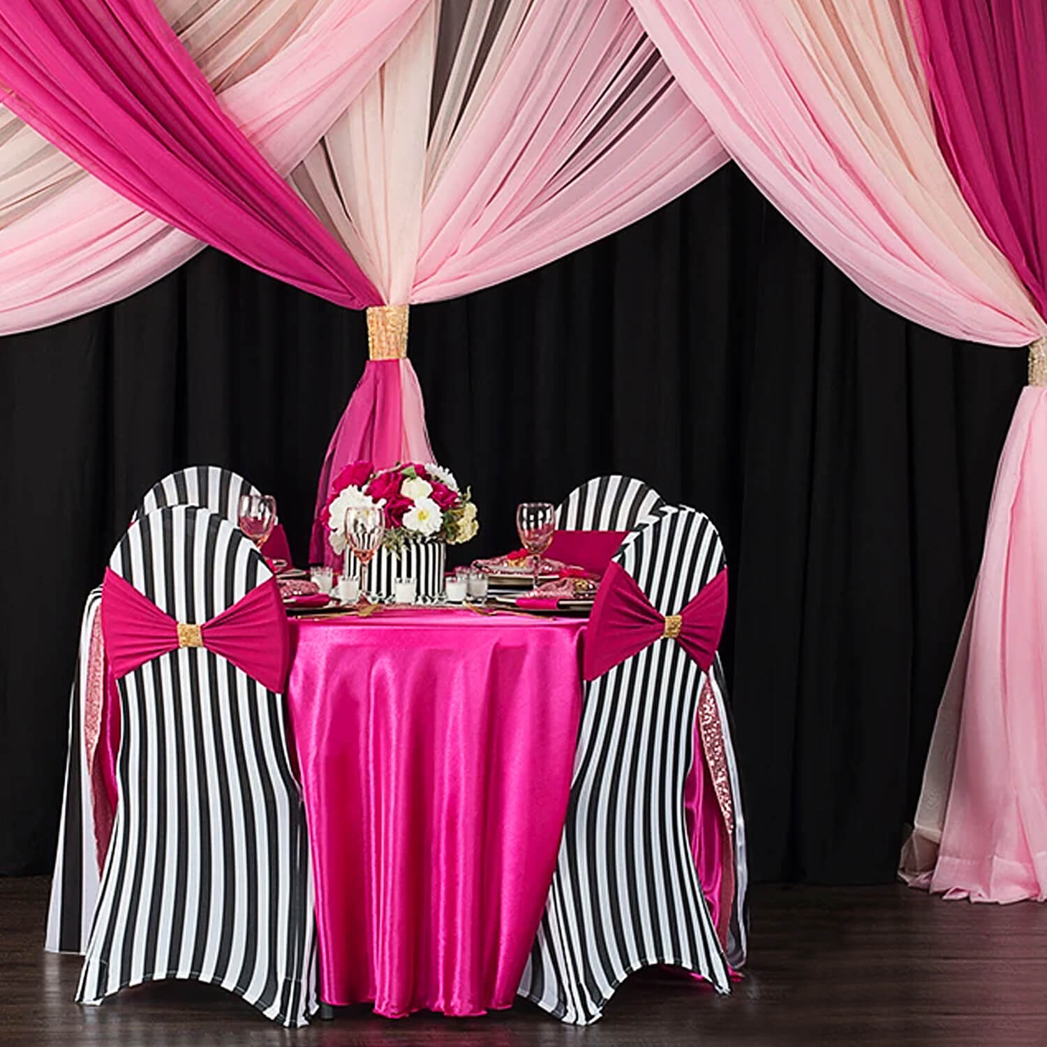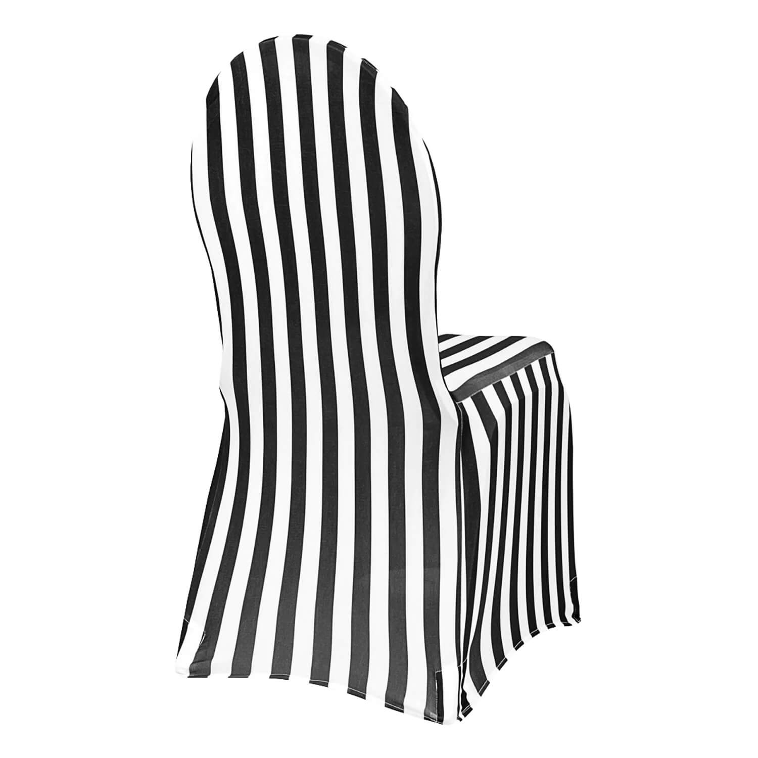 Our one-of-kind striped spandex banquet chair covers are perfect for creating a bold, unique statement at your next event. This striped design combines the classic black and white look and fits the vast majority of chairs. You can add even more style to this striped spandex chair cover with our buckles, brooches, and rhinestone mesh bands.