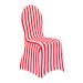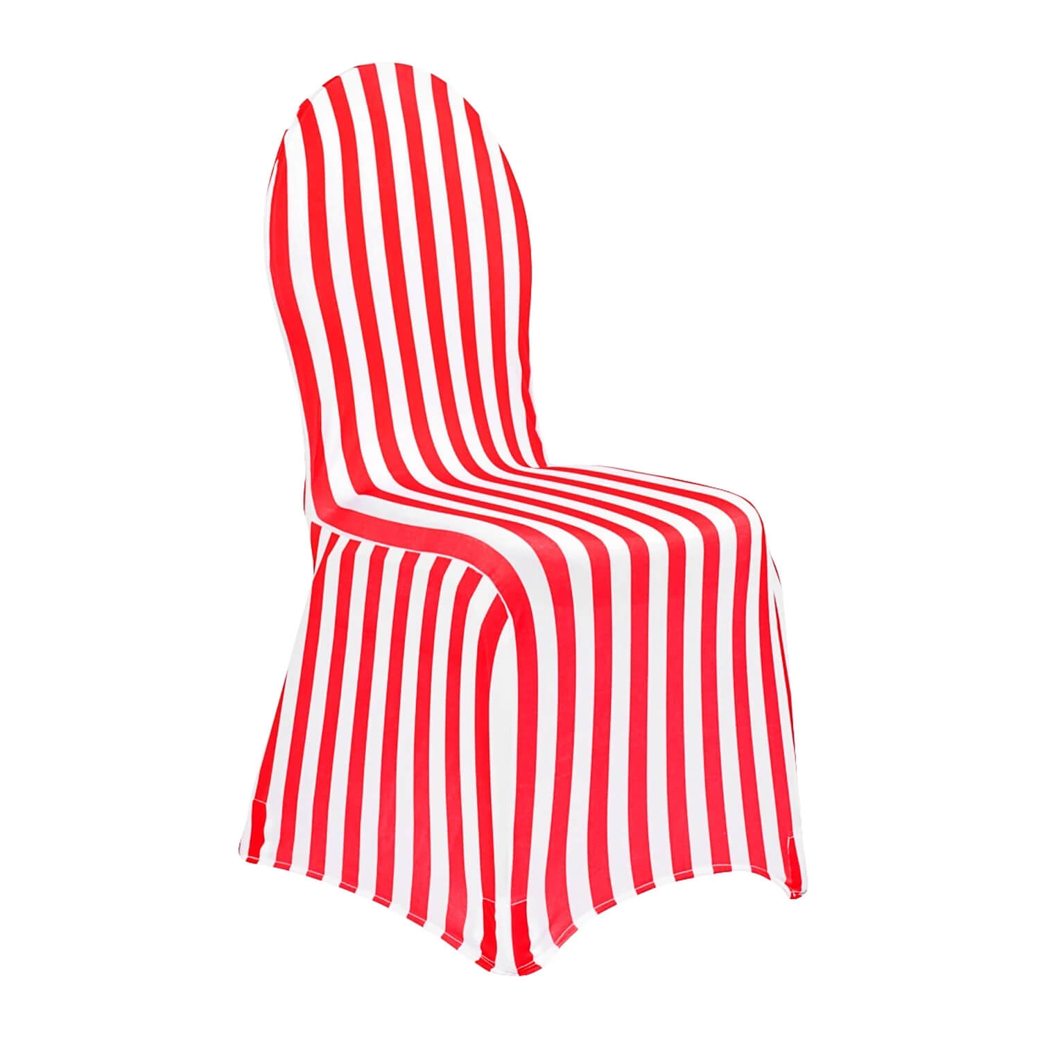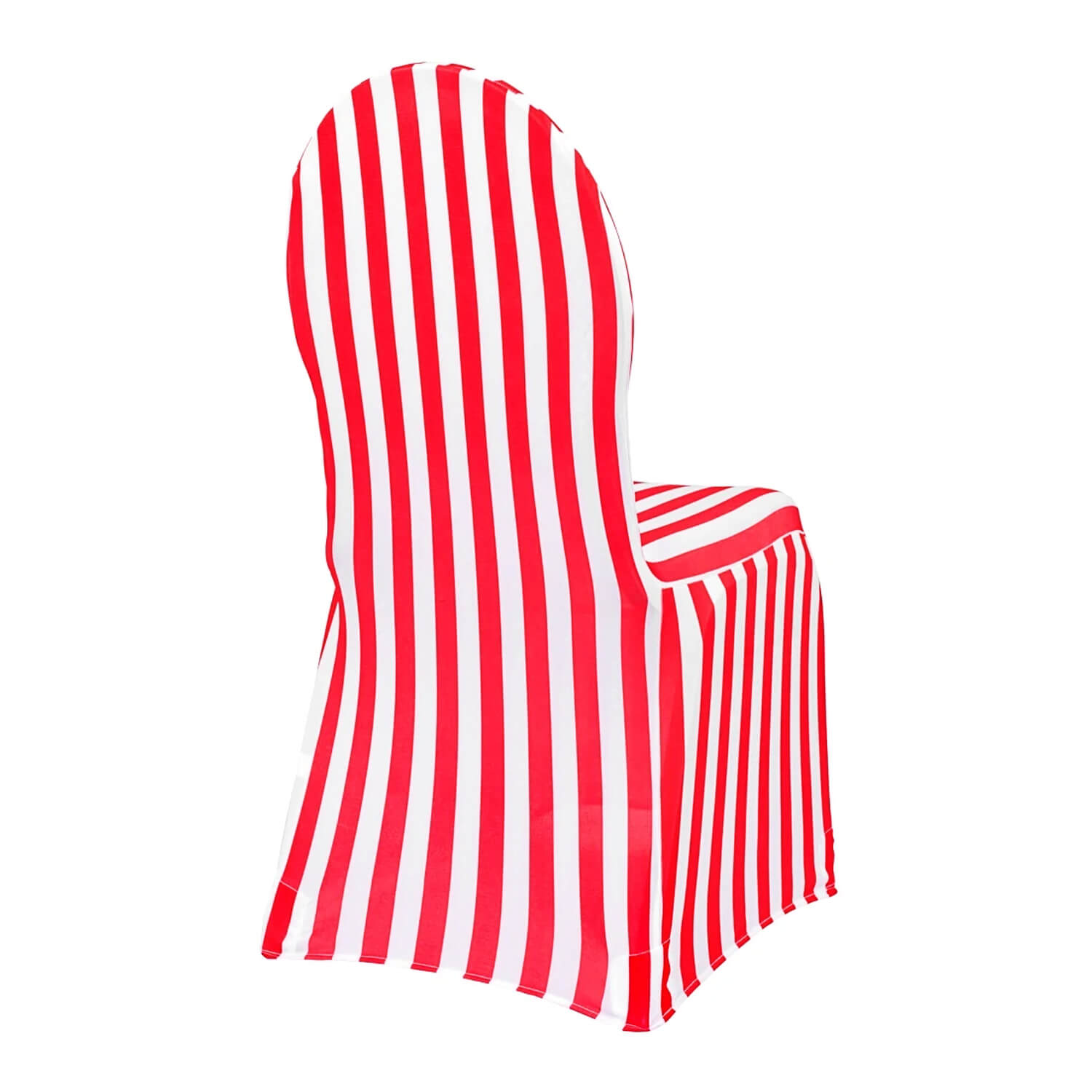 The spandex fabric pulls over banquet chairs of many different styles and sizes for an easy and dramatic transformation . The quality fabric holds up to repeated use, and the red and white stripes match a variety of decorative themes.
