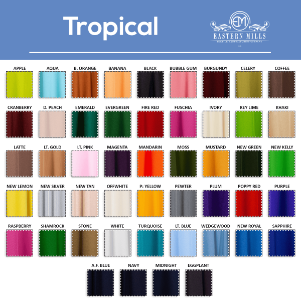 COLORS: Bahama, Apple, Aqua, B Orange, Banana, Black, Bordeaux, Bubble Gum, Burgundy, Celer, Coffee, Copper, Cranberry, D peach, Emerald, Evergreen, Fire Red, Fuchsia, Ivory, Jade, Key Lime, Khaki, Latte, Lilac, Lt Gold, Lt Pink, Magenta, Maize, Mandarin, Moss, Mustard, New Green, New Kelly, New Lemon, New Silver, New Tan, Off White, Orange, P Yellow, Pewter, Plum, Poppy Red, Purple, Raspberry, Shamrock, Stone, Taupe, White, Grey, Turquoise, Lt. Blue, Wedgewood, New Royal, Sapphire, A.F. Blue, Navy, Midnight, Eggplant