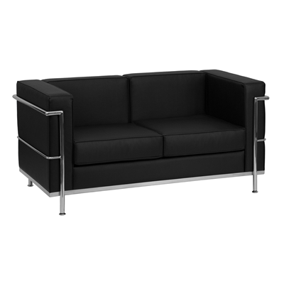 Our contemporary black leather loveseat with encasing frame creates a stylish and modern atmosphere perfect for an office. The stainless steel frame holds removable black cushions made with LeatherSoft and CA117 fire retardant foam. LeatherSoft uses both leather and polyurethane to create soft, durable, and comfortable black leather seating for your guests.