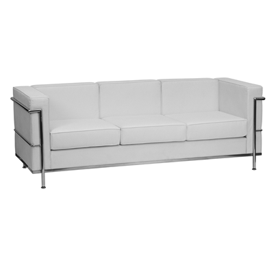This contemporary white leather sofa with encasing frame is perfect for spaces that need beautiful contemporary seating. Similar to our contemporary seat and loveseat, the contemporary white leather sofa sits in an exposed stainless steel frame with white LeatherSoft cushions and CA117 fire retardant foam. We use LeatherSoft as a softer, more durable alternative for seating.