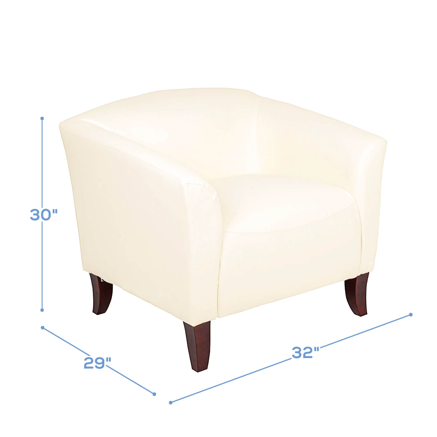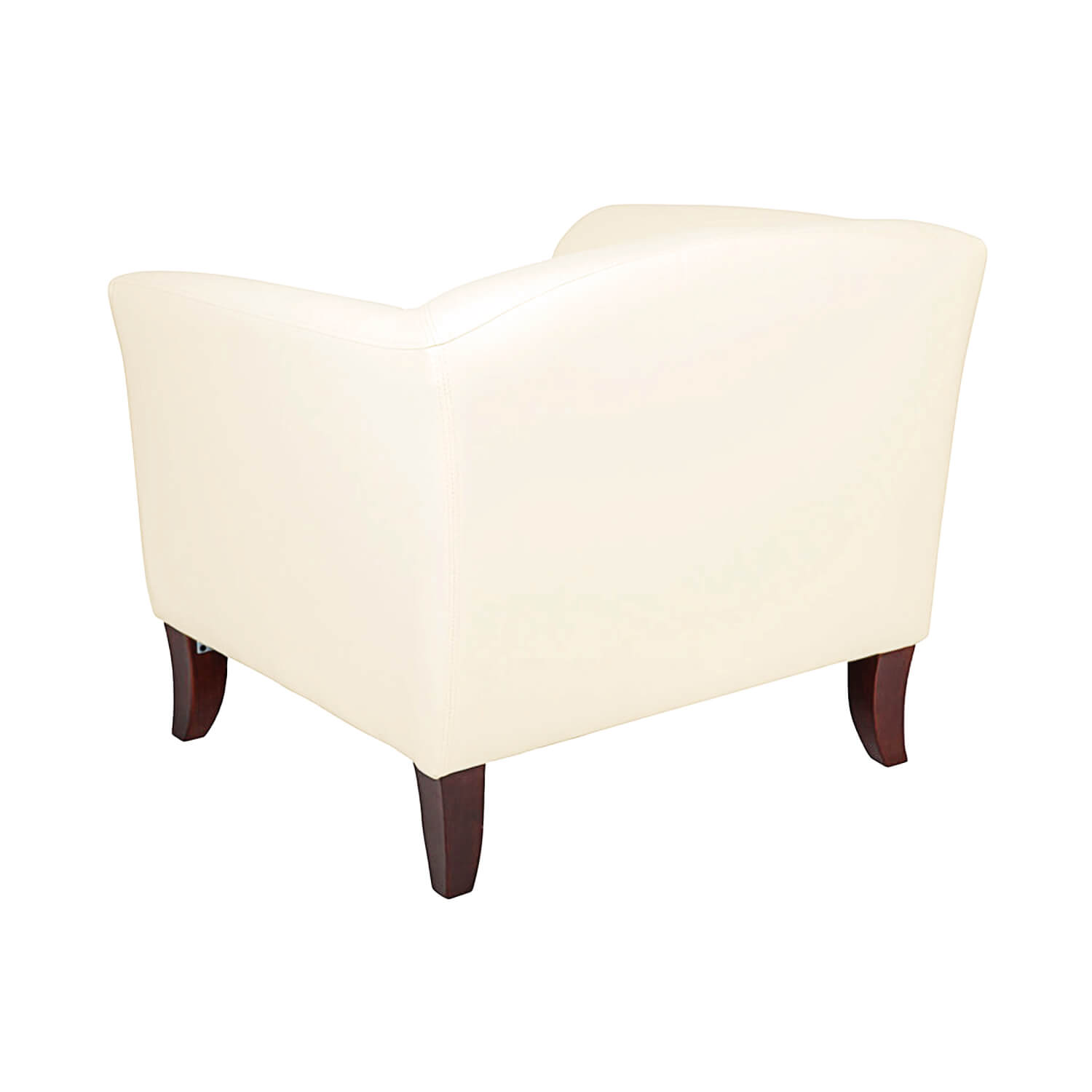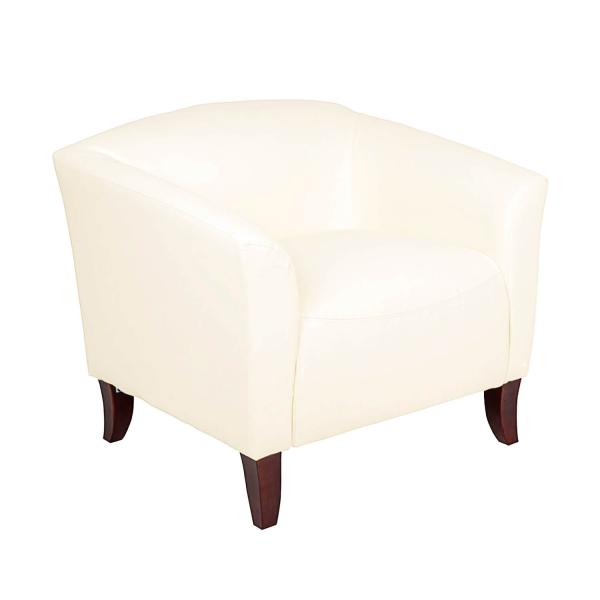 UltraLounge™ white fixed cushion leather chair creates a unique design that will model your company’s amazing style. This white stylish modern design uses curved arms and a curved back to create a durable and comfortable place to sit. The white chair sits on beautiful cherry stained wood feet.