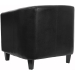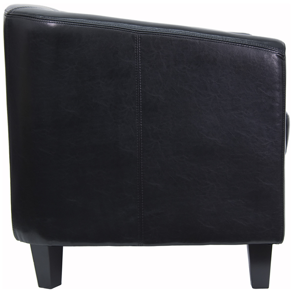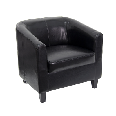 Your guests will never be uncomfortable in our black leather office guest chair. This black office chair is designed for maximum durability, style, and comfort. We tailor stitch fire retardant foam cushions in LeatherSoft fabric to a solid hardwood frame. Our black barrel back chair design gives your space a modern feel.