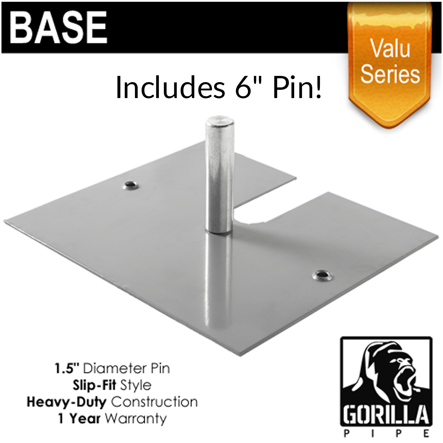 This 16” by 14” standard duty Valu series base weighs down your uprights to keep them secure. The 16” x 14” standard duty base comes with a 6” pin which screws into the base and fits our 2” uprights and a slot to easily stack bases. This base is 10lbs and works best for up to 8ft of height.