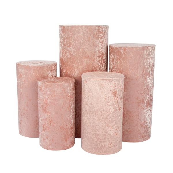 Keep your pedestal and pillar decor minimal and sleek with this spandex cover set. Whether used to cover unsightly surfaces or to add a dash of elegance, these spandex covers will definitely elevate the atmosphere. You can also use them to accentuate the look and feel of cakes, desserts, and pastries. Perfect for weddings, birthday parties, anniversaries, and more. The selection of colors will coordinate with any backdrop or theme, but the blush hue gives them an especially chic look. What's more? The light and durable velvet stretch fabric becomes practically wrinkle-free when stretched so it does not require any ironing, making it the perfect material for repeat use.