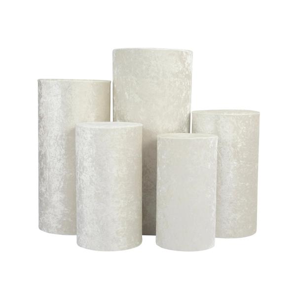 Keep your pedestal and pillar decor minimal and sleek with this spandex cover set. Whether used to cover unsightly surfaces or to add a dash of elegance, these spandex covers will definitely elevate the atmosphere. You can also use them to accentuate the look and feel of cakes, desserts, and pastries. Perfect for weddings, birthday parties, anniversaries, and more. The selection of colors will coordinate with any backdrop or theme, but the ivory hue gives them an especially classic look. What's more? The light and durable velvet stretch fabric becomes practically wrinkle-free when stretched so it does not require any ironing, making it the perfect material for repeat use.