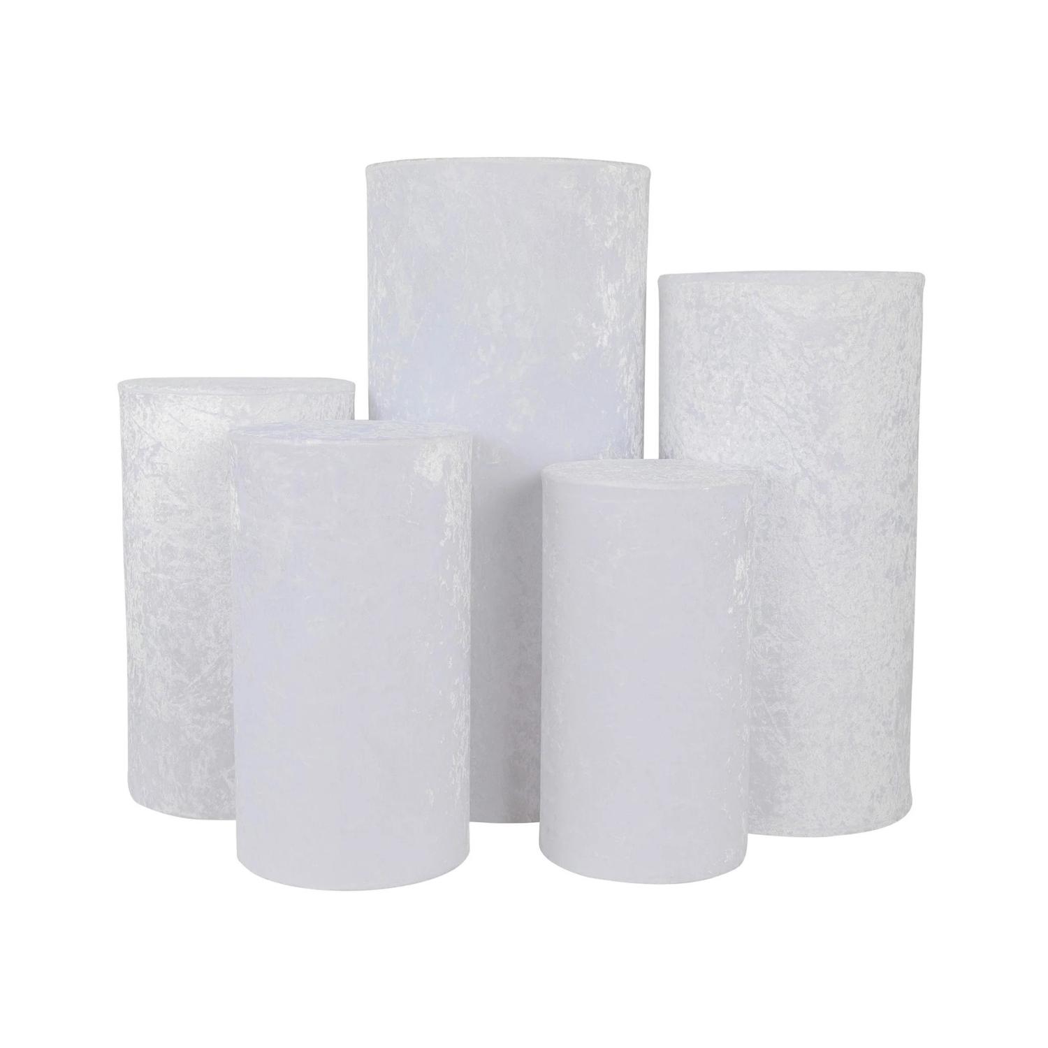 Keep your pedestal and pillar decor minimal and sleek with this spandex cover set. Whether used to cover unsightly surfaces or to add a dash of elegance, these spandex covers will definitely elevate the atmosphere. You can also use them to accentuate the look and feel of cakes, desserts, and pastries. Perfect for weddings, birthday parties, anniversaries, and more. The selection of colors will coordinate with any backdrop or theme, but the white hue gives them an especially classic look. What's more? The light and durable velvet stretch fabric becomes practically wrinkle-free when stretched so it does not require any ironing, making it the perfect material for repeat use.