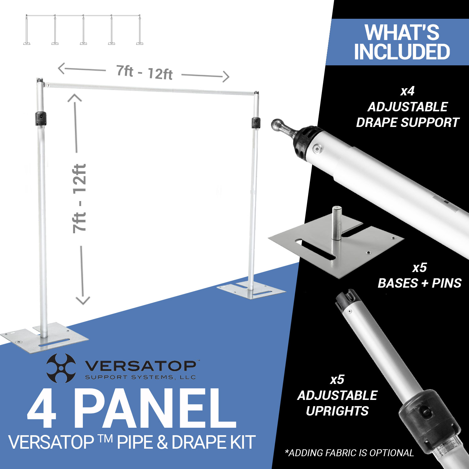 IMPORTANT NOTES: 1. Please allow 48 hours for production of all fabric products. 2. Versatop™ pipe items are only compatible with Versatop™ accessories. 3. For more drape panel options click HERE or give us a call! We are always happy to assist! (800)914-3538 4. Our Adjustable Uprights and Crossbars (Drape Supports) are rated to carry 50 pounds (22.65kg) evenly distributed over the Crossbar (Drape Support). This weight rating is per Sectional Kit and each additional section can support its own 50 pounds. 5. Each backdrop panel is equipped with 3 or 4 drapes (if drape option is chosen, quanity will depends on type of drape)