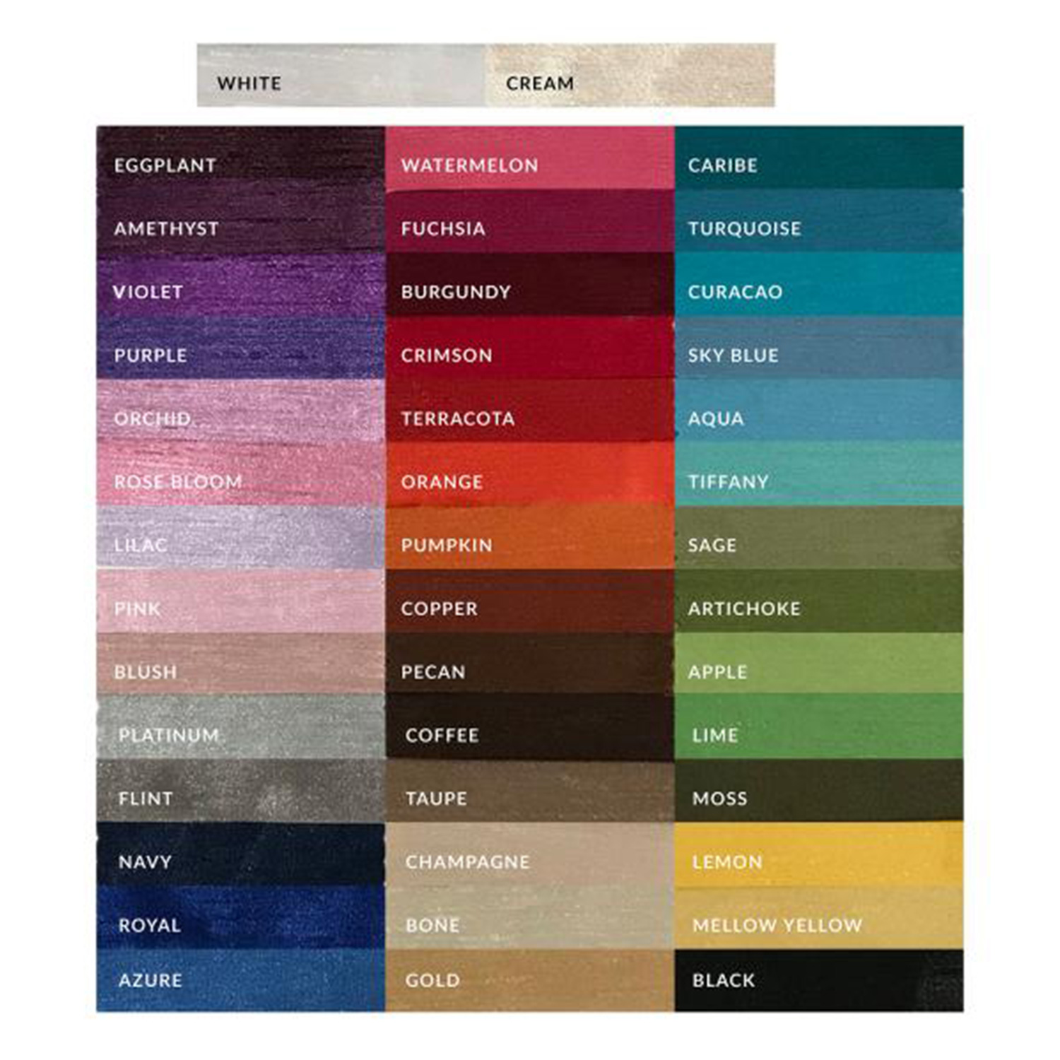 COLORS: Amethyst, Apple, Aqua, Artichoke, Azure, Black, Blush, Bone, Burgundy, Cabrie, Champagne, Coffee, Copper, Cream, Crimson, Curacao, Eggplant, Flint, Fuchsia, Gold, Lemon, Lilac, Lime, Mellow Yellow, Moss, Navy, Orange, Orchid, Peach, Pearl, Pecan, Pink, Pumpkin, Purple, Rose Bloom, Royal, Sage, Sky Blue, Taupe, Terracotta, Tiffany, Turquoise, Violet, Watermelon, White