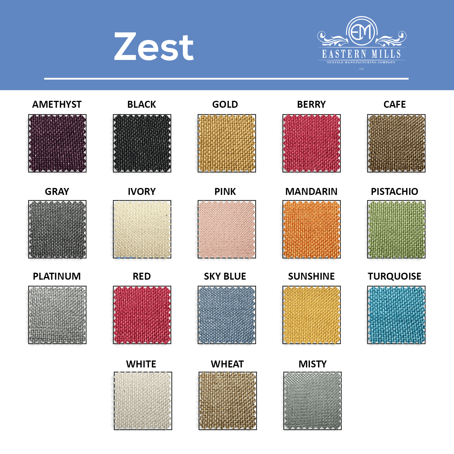 COLORS: Black, Amethyst, Berry, Café, Gold, Gray, Ivory, Mandarin, Pistachio, Platinum, Red, Sky blue, Sunshine, Turquoise, Wheat, White, Pink, Misty